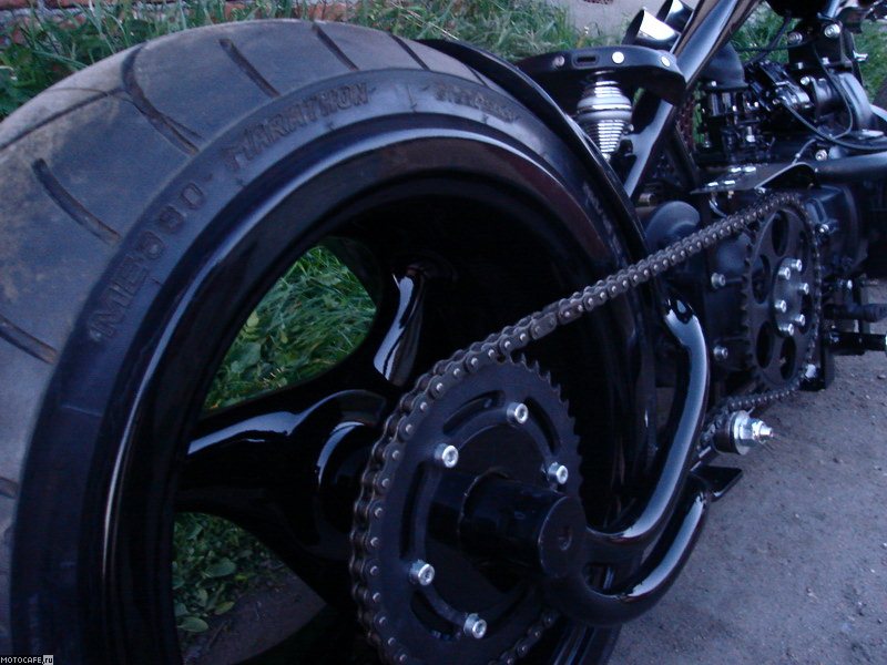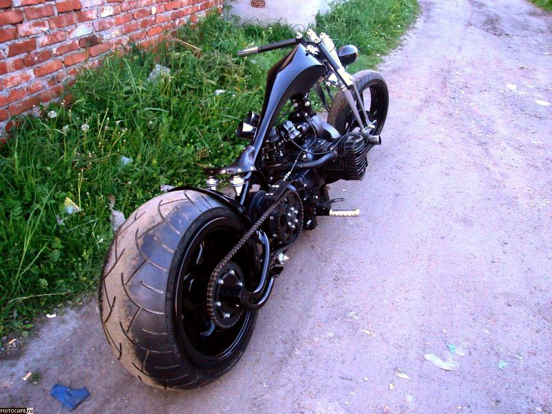 Характеристики кастома: Вилка: харлеевская спринглер Заднее колесо - 280 резина метселер (перед и зад) Двигатель Днепр К750 модификация для мотодрезины с принудительным воздушным охлаждением Система зажигания магнетто Карбюратор - заз (или японская малолитражка) Все кроме движка, передней вилки и переднего колеса - "самопал" Место постройки г. Зеленоградск, Калининградская область, Россия. За информацию спасибо Алексею "Посольскому"